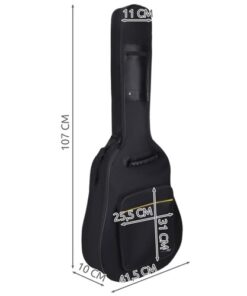 Издръжлив калъф за китара водоустойчив 7880.РЕГУЛИРУЕМИ БРЕЗАНТИ – позволяват индивидуално регулиране спрямо ръста на дете или възрастен. Скобите също значително подобряват комфорта при носене на китарата, ако трябва да изминем по-дълго разстояние, държането й в ръка може да бъде неудобство. УСТОЙЧИВ НА ПОВРЕДИ – калъфът е създаден за ученици, посещаващи музикални училища, както и за професионални музиканти, за които пътуването е неразделна част от живота. ИМА A4 – оборудван е с 2 джоба, горният ви позволява да съхранявате по-малки аксесоари, като капо или кирки, докато долният джоб ви позволява да съхранявате формат A4, така че лесно можете да поставите ноти и няколко други малки предмети в него. ДО 41 ИНЧА – калъфът може да се използва както за класически, така и за акустични китари до 41 инча (максимален размер 105/41 см), дъното е подсилено, така че можем да носим оборудването си в него без страх.