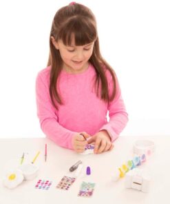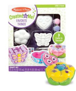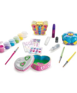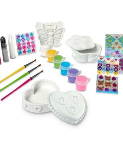 Керамични детски фигурки за декориране . Този увлекателен комплект за занаяти включва 3 любими на децата неща за декориране! Двете кутии за съкровища са с подробен дизайн на цветя и сърца, а касичката с пеперуди включва весели шарки от двете страни. Включва също 20 стикера със скъпоценни камъни, 56 стикера от фолио, 6 саксии с боя, 3 четки за рисуване, 2 блестящи лепила и бяло лепило за добавяне на уникални лични щрихи за създаване на занаяти, вдъхновени от вас и вашето въображение! Разгледайте още продукти в категорията “Творчески комплекти” – ТУК