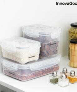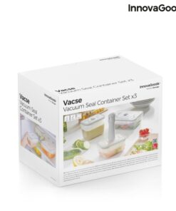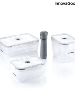 Комплект вакуумни кутии за храна InnovaGoods. Универсален комплект от 3 контейнера за вакуумно опаковане с различни размери и капацитет, идеален за запазване на храната по-свежа за по-дълго, с всичките ѝ вкусове и хранителни вещества. Освен това са изключително полезни за ускоряване на процеса на мариноване на някои храни. Разполагат с капак с вакуум клапан и 4 херметични, против прокапване и против разливане. Включва ръчна вакуумна помпа за лесно вакуумно опаковане на храни, подобрявайки и удължавайки оптималното съхранение до 3 пъти. Просто трябва да поставите вакуумната помпа върху клапана на капака, като упражнявате натиск върху нея и движите буталото на помпата нагоре и надолу, докато целият въздух не бъде отстранен от вътрешността на контейнера. Вакуумът се освобождава чрез натискане на клапана на капака. Тези оригинални многофункционални и многофункционални контейнери за храна са подходящи за хладилник и фризер, като ви позволяват да организирате храни и да използвате максимално пространството. Те също така са подходящи за микровълнова фурна, така че можете да загрявате храна и за бързо готвене с ниско съдържание на мазнини. Могат да се почистват лесно в съдомиялна машина. Идеални за всички видове храни (месо, риба, студени меса, зеленчуци, бисквити, закуски, супи, салати и др.). Ако желаете, те могат да се използват и за пренасяне на храна, като обикновена кутия за обяд.