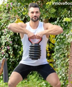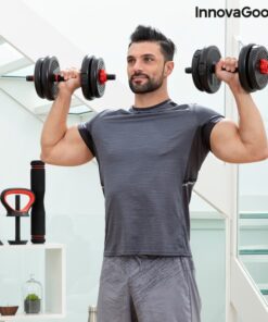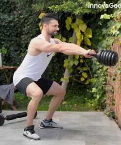 Комплект гири 6 в 1 дъмбели за домашен фитнес InnovaGoods е фитнес комплект с регулируеми и гъвкави гири, идеални за удобно и лесно влизане във форма у дома. Позволява ви да направите цялостна тренировка с много укрепващи упражнения (цяло тяло) за развитие и укрепване на всички мускули на тялото (ръцете, краката, раменете, гърба, гърдите и др.). Благодарение на оригиналния си напълно разглобяем дизайн и регулируемо тегло, комплектът гири предлага разнообразие от опции и е много лесен за транспортиране и съхранение, тъй като заема много малко място при разглобяване. Всеки вид тежест може лесно да се сглоби с необходимите части, които включват (подплатена щанга, щанга за дъмбел, 2 щанги за дъмбел, 2 мултифункционални дръжки, 4 резбовани пръстена и 8 плочи за тежести). Вземете различни видове тежести, като комбинирате щанги, дръжки и дискове (гири, дъмбели, тежести за щанги). Дръжката е чудесна и за правене на подови преси и други упражнения. Качествените материали са здрави и не увреждат пода или други повърхности. Неплъзгащите се дръжки осигуряват стабилен захват по време на употреба. Този модерен комплект тежести е ергономичен, унисекс и подходящ за всички нива, така че може да се използва от начинаещи, любители на този спорт или по-опитни и професионални потребители. Включва ръководство за упражнения.