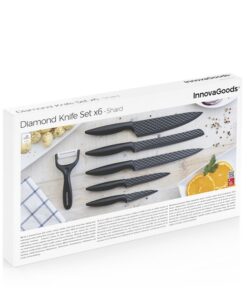Комплект диамантени ножове Shard InnovaGoods. Техните оригинални, максимално незалепващи режещи остриета с диамантен дизайн ви позволяват да правите срезове с пълна прецизност. Този най-висок в гамата пълен комплект ножове включва различни видове ножове за специфични храни и видове рязане. Презентационният калъф е с магнитно затваряне, а комплектът ножове е идеален подарък.