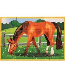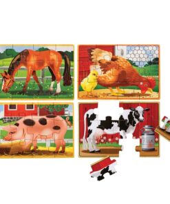 Комплект дървени пъзели в кутия Животните от фермата . Комплектът включва четири дървени пъзела със селскостопански животни от 12 части – кокошка и нейното пиленце, крава, прасе и кон – всеки съхраняван в отделно отделение на здрава дървена кутия. Плъзгащият се капак на кутията служи и като удобна дъска за пъзел! Всяка част от пъзела е с кодирана форма на гърба за лесно сортиране. Чудесно за пътуване! Разгледайте още от категорията “Дървени пъзели” ТУК!