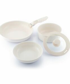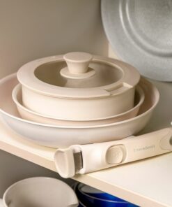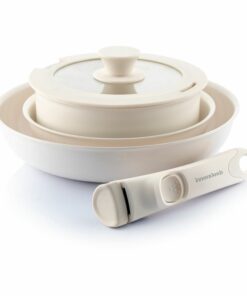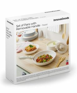 Комплект тигани с подвижна дръжка Passet InnovaGoods. Модерен комплект тигани с подвижна дръжка и капак е идеален за оптимално и безопасно готвене на всички видове храни. Благодарение на техния дизайн, който може да се подрежда, те спестяват място. Подходящ за всички видове котлони, хладилник, фурна и съдомиялна. Универсален комплект от многофункционални тигани, който включва 2 тигана (Ø26-20 см), 1 тенджера (Ø18 см), 1 стъклен капак със силиконов ръб (Ø18 см) и 1 сменяема подвижна дръжка. Модерен дизайн, 5 части: нашият комплект тигани с подвижна дръжка включва 2 тигана (Ø26 и Ø20 см), тенджера (Ø18 см), стъклен капак със силиконов ръб (Ø18 см) и подвижна и сменяема дръжка. Пълен комплект тигани в кремав цвят, идеални за най-модерните и практични кухни. Незалепващо, равномерно нагряване: тези иновативни и висококачествени алуминиеви тигани отговарят на всички разпоредби за безопасност на храните, те са леки, здрави и издръжливи. Благодарение на незалепващата повърхност и равномерното им нагряване, те улесняват и оптимизират готвенето на всички храни. Подреждаща се, подвижна дръжка: нашият комплект тигани с незалепващо покритие ви позволява да поддържате кухнята си подредена и да пестите място, тъй като те могат да се подреждат лесно (един в друг). Освен това дръжката е взаимозаменяема и подвижна, така че може да се съхранява отделно и заема по-малко място в шкафове, чекмеджета и др. Многофункционален, лесен за почистване: този универсален комплект тигани със сменяема дръжка е идеален за готвене на всички видове храни, но може да се използва и като набор от контейнери за съхранение и консервиране на храни в хладилника, като съдове за печене (без дръжка или капак) и т.н. Освен това те могат да се почистват лесно в съдомиялна машина. Подходящ за всеки котлон: този оригинален комплект тигани, които могат да се подреждат един върху друг, е подходящ за газови, индукционни, електрически, витрокерамични и халогенни котлони. Освен това е устойчив на фурна (без дръжка или капак), тъй като е устойчив на високи температури.