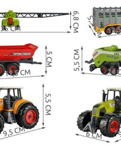 Комплект трактори и фермерски машини – детски играчки.Тракторите и селскостопанските машини, включени в комплекта, са с точни форми на отделни компоненти. Отделно боядисаните елементи на шасито, каросерията и джантите, както и отделни части на машините карат комплекта да привлича вниманието и да насърчава детето да играе. Машините имат движещи се части, които частично отразяват тяхната работа в реалността и по този начин правят играта по-привлекателна. Комплектът с трактори включва 6 елемента, които позволяват дълго време на забавление имитирайки с детайли работа във фермата.