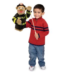 Кукла за куклен театър Пожарникар Melissa & Doug. Началникът на пожарната Уолтър Блейз е винаги на смяна и е готов със своята защитна каска и светлоотразително палто, за да спаси положението! Използвайте едната ръка, за да манипулирате устата и изражението на лицето на куклата, докато жестикулирате с подвижния дървен прът с другата. Сваляща се пръчка е подходяща за левичари и десничани! Разгледайте още от категорията “Кукли за ръце за куклен театър” ТУК!