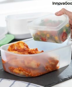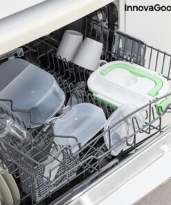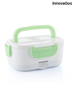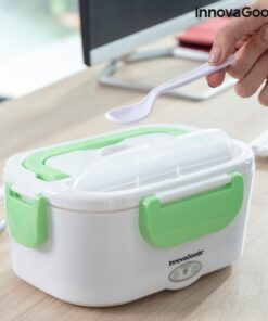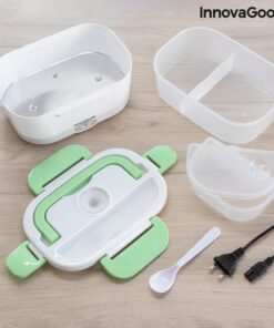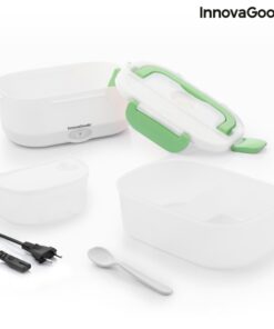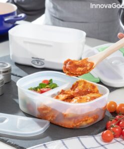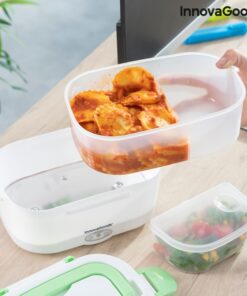 Кутия за храна с електрическо подгряване InnovaGoods е практична кутия за обяд за затопляне на храна или поддържане на топлина без нужда от микровълнова печка. Идеален способ за носене на обяд на работа или по време на пътуване и лесно мжете да я загреете в колата- просто включвате кутията за обяд в гнездото на запалката с помощта на сменяемия адаптер, който е включен в комплекта, изчаквате няколко минути и се наслаждавате на топла домашно приготвена храна. Електрическата кутия има капацитет от 1,05 л и може да достигне максимална температура до 70 ºC. В кутията има подвижна тавичка с 2 отделни отделения и по-малък контейнер с капак, който също може да се сваля, така че и двете могат да се почистват лесно в съдомиялна машина. Контейнерът с капак е полезен за салати или десерти, а другият за храните, които ще затоплите. Капакът на кутията за обяд има клапан за освобождаване на пара и отделение за прибори, което включва лъжица. Освен това има 4 предпазни закопчалки за затваряне и сгъваема дръжка за носене, така че можете да го носите навсякъде по-удобно. Може да се използва и като обикновена кутия за обяд за студени или пресни храни.