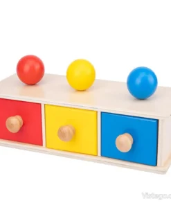 Този комплект представлява продълговата дървена кутия с отделения, в които се поставят чекмеджета. Детето може да изважда и прибира чекмеджетата, да сравнява цветовете и да подрежда елементите по логичен начин. Към кутията с чекмеджета са включени и цветни топчета, които съответстват на цветовете на чекмеджетата, което улеснява играта на съвпадение и сортиране.