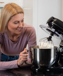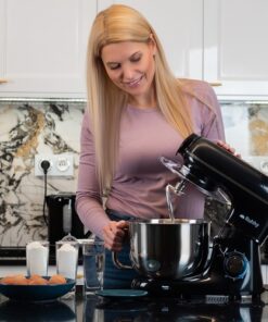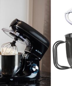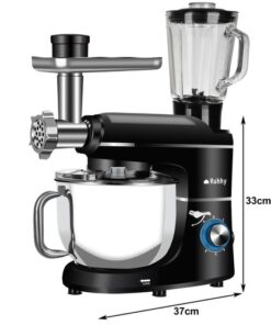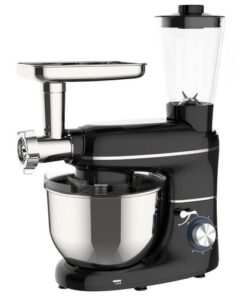 Кухненски робот с блендер и сладкарски сет. 3 в 1 – три устройства в едно. Блендер – роботът има отделен стъклен съд от 1,5 л, следващото устройство е месомелачка с 3 различни размера. Машината разполага с 6,2-литрова купа, която е снабдена със солидна дръжка, която ще ви улесни при работа и изваждане на съдържанието от нея. Изработен е от неръждаема стомана и има предпазител против пръски, който ви позволява да го поддържате чист дори при смесване на висока скорост. В комплекта са включени 3 приставки за приготвяне на храна. За идеално комбиниране на съставките на тестото се използва бъркалка със силиконови ребра. Куката е предназначена за замесване на тесто, напр. тесто с мая и бъркалка, която се използва за разбиване на леки съставки като разбита сметана или яйчен белтък. Уредът е оборудван с 6 нива на работна скорост, всяко адаптирано към нуждите на рецептата, изпълнявана в даден момент, вкл. разбиване, бъркане, месене на тесто и др. Освен това има функции PULSE. Включва: робот, купа, кука, гъвкава бъркалк,а предпазител от пръски пасатор (стъклена кана 1,5 л), тава за месомелачка за сервиране на месо, бутачка за месо, 3 цедки, БЕЗПЛАТЕН ръкав за сладкарски изделия + 24 декоративни накрайника в органайзера.