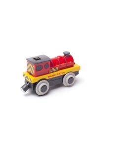 Локомотив с батерии в червено Bigjigs. Увеличете силата на дървената си железница с локомотив Bigjigs Rail в червен цвят, който работи на батерии. Гледайте го как се движи с дървения влак като самостоятелен двигател или с вагони, прикрепени към неговия магнитен съединител. Красивият червен цвят придава чар на дървения комплект влакове. Това е влак, работещ с батерии, който изисква 2 x AAA батерии (не са включени). Магнитните съединители осигуряват съвместимост с всички останали двигатели и колички в гамата Bigjigs Rail. Повечето други големи марки дървени железопътни линии са съвместими с Bigjigs Rail. Отговаря на настоящите европейски стандарти за безопасност. Разгледайте още от категорията “Дървени влакчета” ТУК