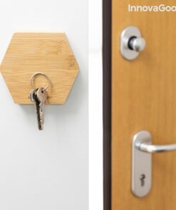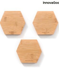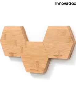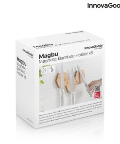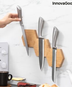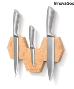 Магнитни държачи за ножове от бамбук InnovaGoods комплект от 3 магнитни залепващи бамбукови стойки, използвани главно като кухненска стойка за всички видове ножове, но може да се използва и за ножици, гаечни ключове и други метални предмети. Техният модерен и оригинален дизайн ги прави много гъвкави и адаптивни, предлагайки много опции. 3-те дъски могат да се поставят в различни позиции заедно или поотделно. Те се отличават със силно двустранно лепило за оптимално фиксиране и лесен монтаж без инструменти. Монтажната повърхност трябва да е гладка (без дупки) и веднъж залепена, дъската не може да бъде отлепена и преместена на друга повърхност. Вградените им магнити имат висока магнитна сила, осигуряваща стабилно задържане на метални предмети. Тези универсални стойки са много удобни, лесни за използване и почистване. Освен това те са малки и леки, оползотворяват максимално наличното пространство и помагат да се поддържат нещата спретнати и организирани.