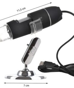 – диаметър на обвивката: 3см; диаметър на основата: 7см; размери на микроскопа (дължина / ширина): 11,5 х 3 см; дължина на кабела: 140 см