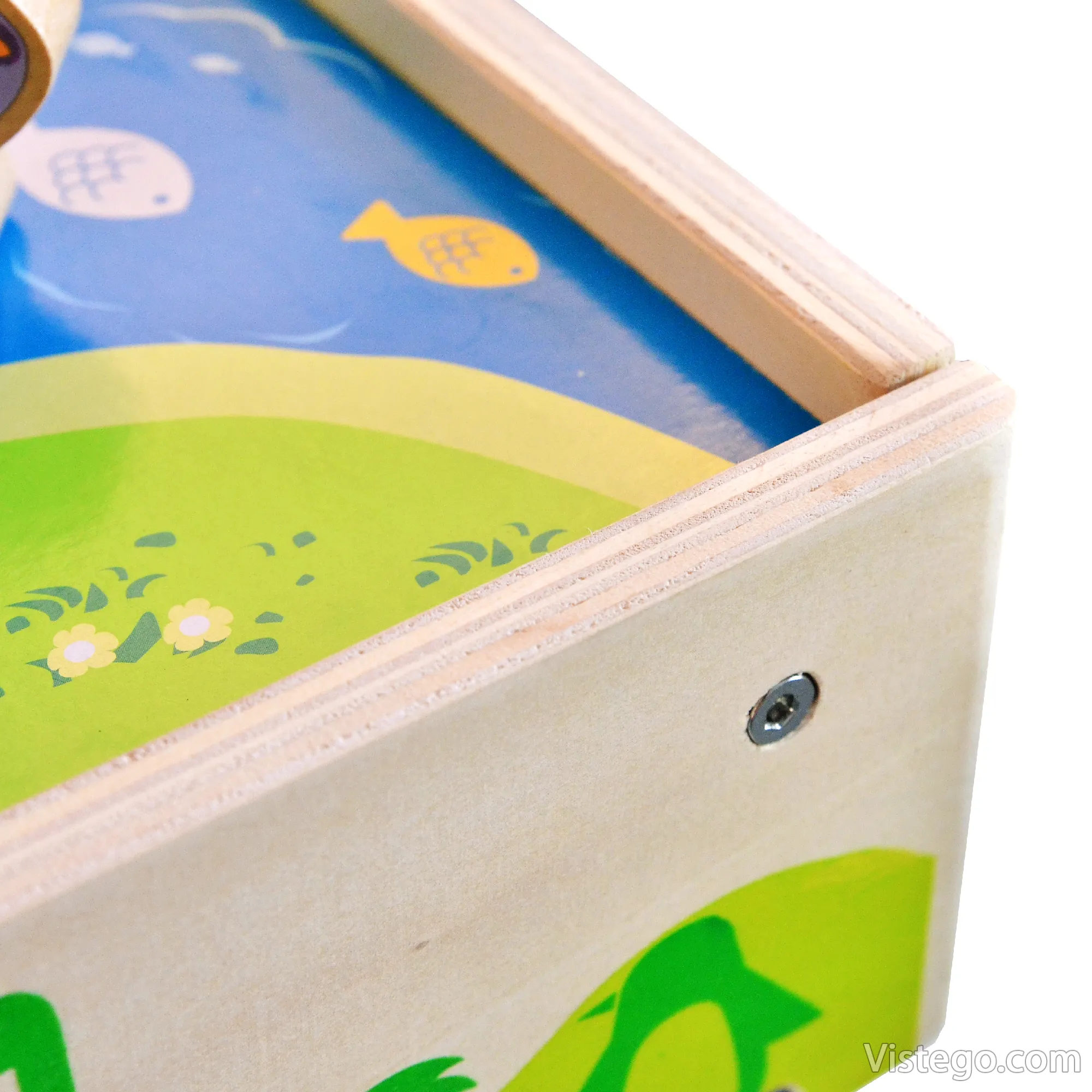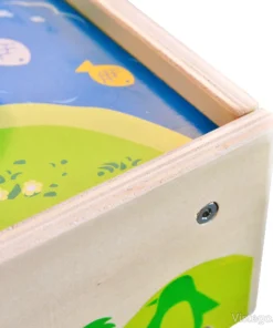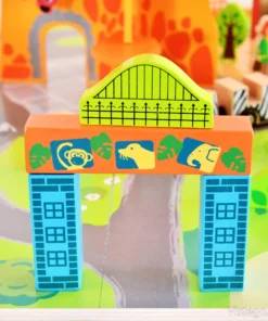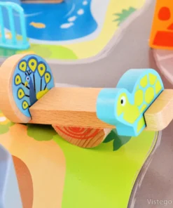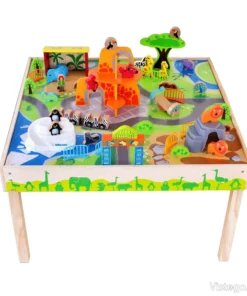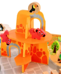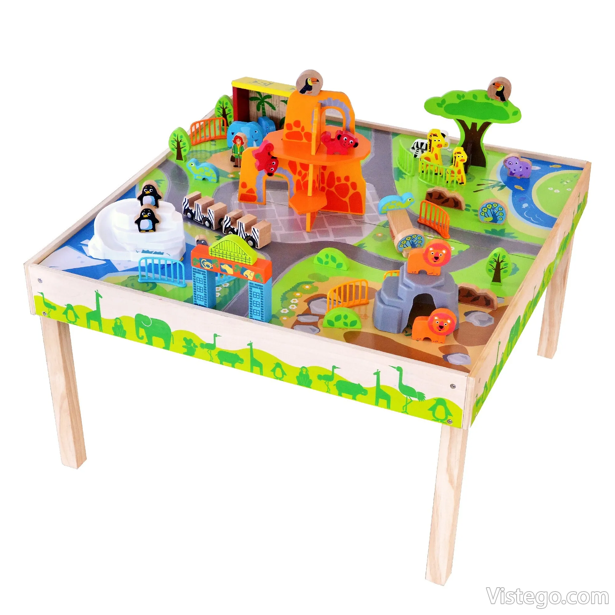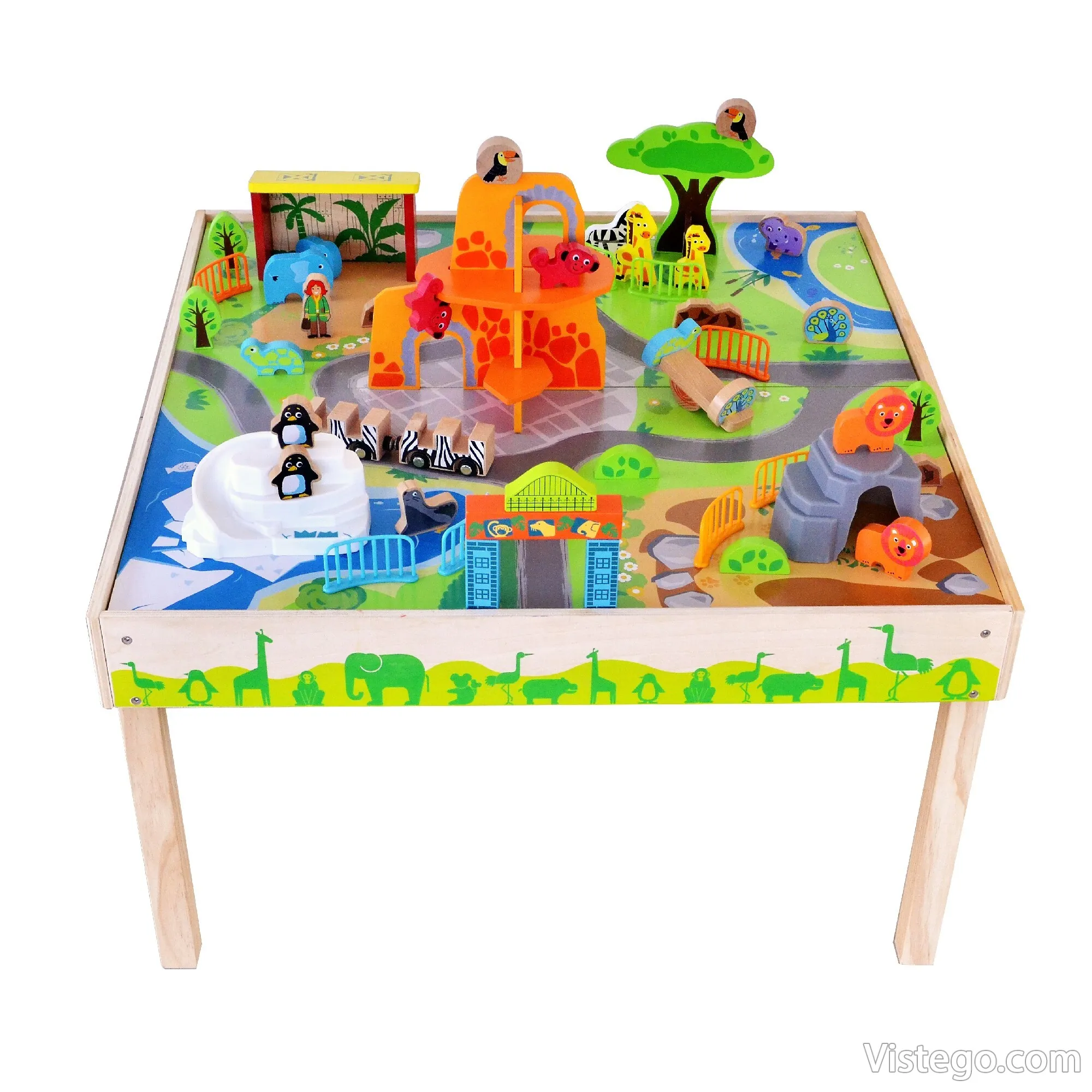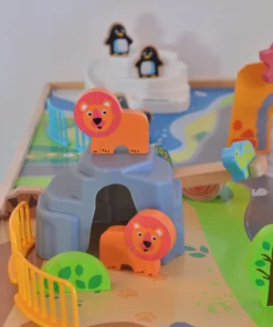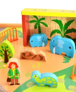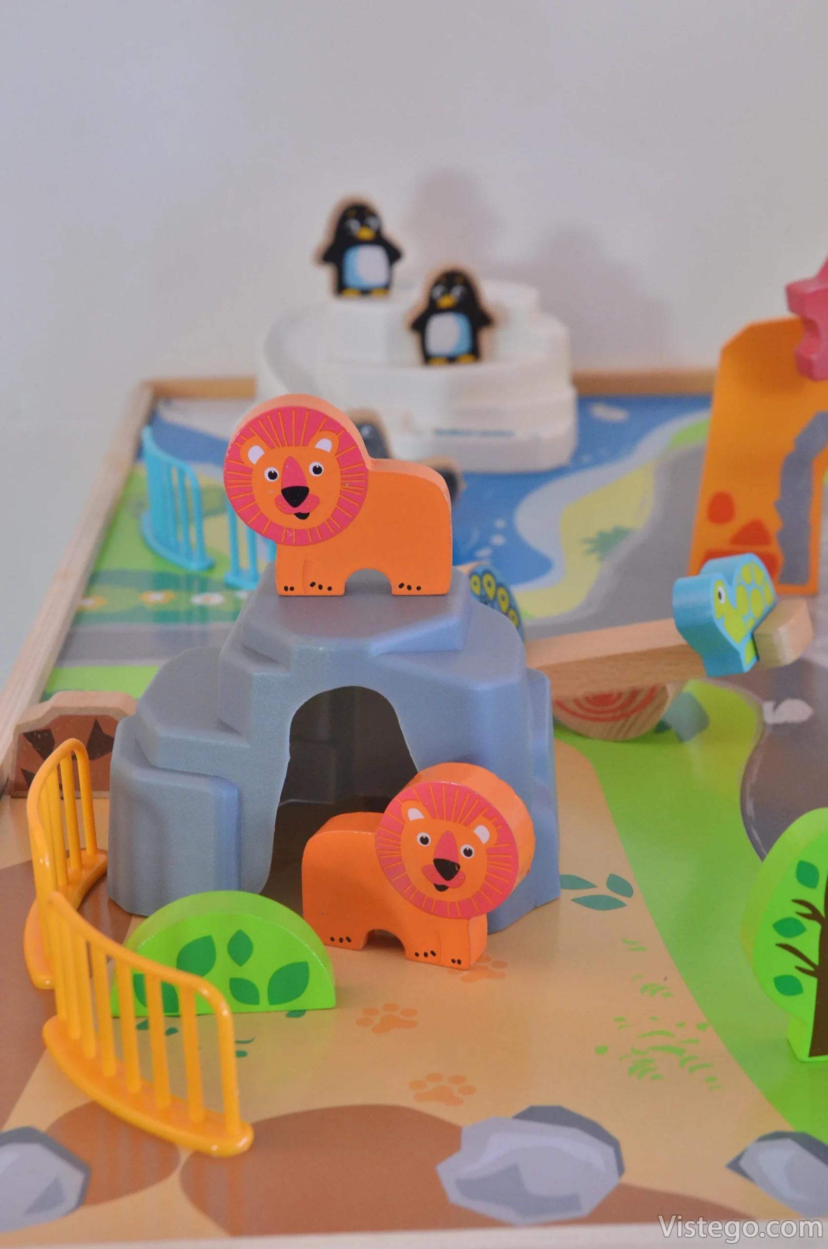 На масата са разположени различни зони с животни като лъвове, слонове, маймунки, пауни, костенурки и пингвини, което позволява децата да разширят познанията си за природата. Към комплекта е включено и дървено влакче, което обикаля около зоните със животни, добавяйки интерактивност към играта. Всички елементи са изработени от безопасни материали и са специално проектирани за малки ръчички.