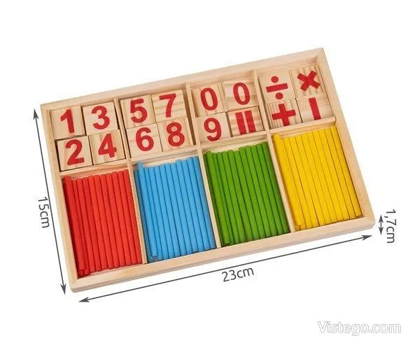 Математическа игра от дърво по Монтесори за учене на числа чрез броене, сметало и цветни пръчки, подходяща за игра у дома.