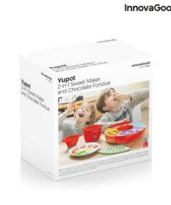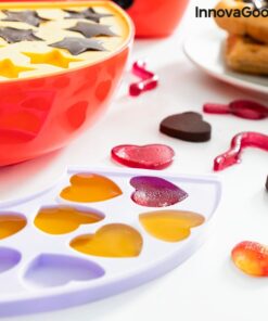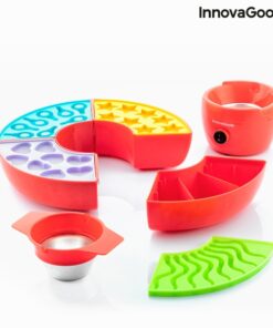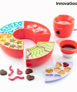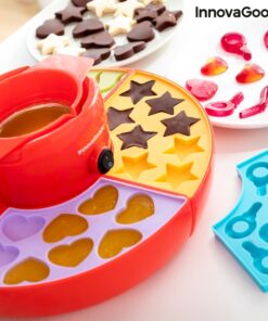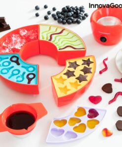 Машина за производство на бонбони и фондю InnovaGoods е вашата машинка мечта! Освен шоколадови изкушения можете да си правите и желирани бонбонки. Перфектен подарък за малки и големи, любители на сладките изкушения. Оригинален многофункционален и многоцветен дизайн радва както деца, така и възрастни. Идеален за приготвяне на изискано шоколадово фондю или вкусни желирани бонбонки с натурални съставки подбрани от вас самите. Разполага с централен електрически контейнер, в който да загреете желаното съдържание в подвижна купа с дръжки, която ви позволява лесно да наливате сместа, без да се изгорите. Машинката за бонбони включва 4 различни силиконови форми за придаване на забавни форми на желираните или шоколадовите бонбони (8 във всяка форма). Освен това има кръгла тава, която може да се демонтира и разделя на 4 части с по 3 отделения всяка. Под силиконовите формички може да се постави лед, за да се охлади по-бързо сместа и така да завърши процеса на приготвяне. Кръглата тава е идеална и за сервиране на плодове, бисквити, сладки и др., които да придружават шоколадовото фондю. Инструкциите за употреба включват подробности за съставките и процеса на приготвяне на фондю, желирани бонбони и шоколадчета.