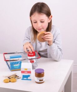 Метална детска кошница за пазар Bigjigs. Обиколете магазините с тази живописна метална кошница за играчки и дървени имитационни храни. Перфектно приспособена за малките детски ръчички, кошницата е изключително удобна за носене благодарение на ярката си червена дръжка. Тази телена кошница за пазаруване е изключително здрава и може да побере всички вашите хранителни стоки. Комплектът включва дървено мляко, зърнени храни, супа, бисквити, шоколадова мазнина и хляб. Прочните дръжки се сгъват плоско за лесно прибиране или подреждане. Кошниците за пазаруване представляват прекрасно допълнение към всяка детска кухня или игрови магазин. Този забавен начин насърчава креативна и въображаема ролева игра. Изработен от висококачествени материали с отговорни източници, продуктът отговаря на всички текущи европейски стандарти за безопасност. Подходящ за деца над 3 години. Разгледайте още от категорията “Детски дървени магазини” ТУК!