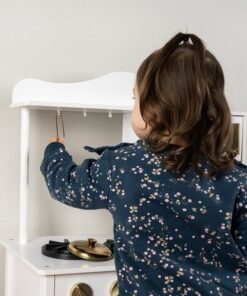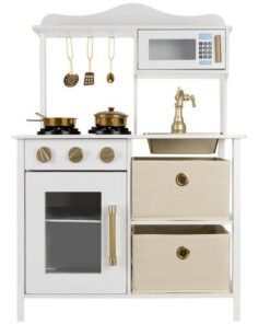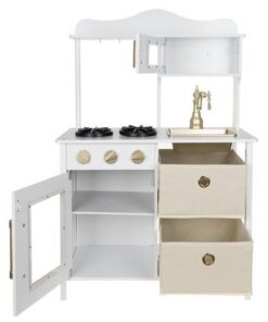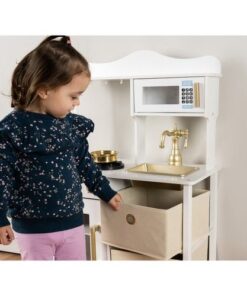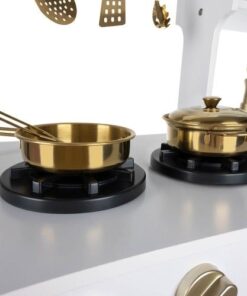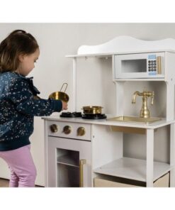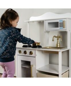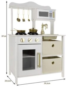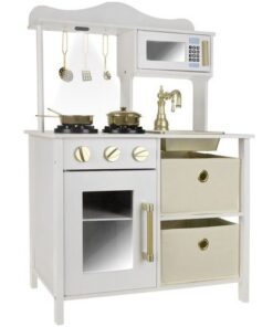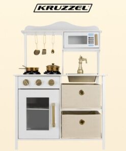 Модерна дървена детска кухня за игра с аксесоари Kruzzel. Представяме ви модерната дървена кухня за игра в бял, бежов и златист цвят от Kruzzel. Тази кухня предлага несравнимо забавление и възможност за развитие на въображението и творческото мислене на децата. С тази дървена кухня, децата могат да се насладят на моменти на истинско готвене. Кухнята е оборудвана със светодиодна лампа, която може да бъде поставена под шкафа, в шкафа или във фурната, в зависимост от предпочитанията на малките готвачи. Това осветление не само придава атмосфера на истинска кухня, но създава още по-реалистично изживяване, особено когато стаята е тъмна. Децата могат да се научат на приготвянето на храна, като подготвят вечеря за своите кукли, мечета или дори родителите си. Тази кухня разполага с горелки, които светят и издават щракащи звуци при завъртане на копчетата, което прави готвенето още по-реалистично и забавно за децата. В комплекта са включени 4 лъжици: черпак, лъжица за спагети, решетъчна лъжица и лъжица за паста, както и тенджера, тиган и капак. Допълнително, кухнята разполага с подвижна мивка, която децата или родителите могат да използват, за да измият „мръсните“ чинии след игра. Този продукт е изработен от висококачествена дървесина, което гарантира продължителност и сигурност за децата. Модерният дизайн в бял, бежов и златист цвят придава на тази дървена кухня за деца стил и елегантност, които сигурно ще бъдат оценени от малките готвачи. Допълнително, кухнята предлага образователна функция, като насърчава ролевите игри, учи на групово сътрудничество и развива социални и интеграционни умения. Тя подпомага ръчните и актьорските умения на децата и може да се превърне в источник на вдъхновение за бъдещи готвачи. Децата обичат да наблюдават света около тях и да имитират възрастните. Тази дървена кухня е фантастичен начин за децата да се забавляват и да научават като играят ролеви игри. Тя съчетава забавление и образование, което я прави чудесен избор, особено когато времето навън не позволява игри на открито. Тази кухня е многофункционална и разполага с плот, рафтове, шкафове, котлони, мивка с кран, микровълнова печка, фурна и голям хладилник. Вратичките са подвижни, като добавят още реализъм към играта. Продуктът е със светеща лампа, която подпомага готвенето и придава допълнителен реализъм. Той се предлага в бял и златист цвят, което го прави подходящ както за момичета, така и за момчета.