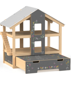 Отворена дървена къща за кукли Обзаведена Bigjigs. В натурални цветове и красиво конструирана, обзаведената отворена куклена къща гарантира дълги и забавни игри. Изключително здрава, изработена от букова дървесина, децата могат да я украсят както желаят – от всичките ѝ страни има черни дъски за рисуване с тебешири. Могат да се нарисуват растения, прозорци, врати или др. В къщата ще намерите и четири комплекта мебели (16 на брой) за баня, хол, спалня, кухня, както и подвижно стълбище. Към къщата има и голямо чекмедже за съхранение, което може да увеличи и пространството за игра и върху, което децата могат да нарисуват градинка с растения. Къщата позволява и групова игра, а след като играта приключи, мебелите могат да се приберат в чекмеджето. Игрите с къщата насърчават ролевата игра, въображението и креативността. Изисква се сглобяване от възрастен. Изработката е от висококачествени и безопасни материали. Разгледайте още от категорията “Къщи за кукли и принадлежности” ТУК!