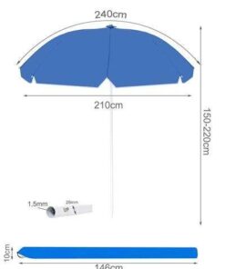 Плажен градински чадър в син цвят Майорка 2.4м. UV филтър, който благодарение на сребърното си покритие, отразява слънчевите лъчи и ефективно предпазва от прекомерно слънце и вятър, което е изключително важно, ако отивате на плаж с деца и искате да им осигурите безопасна почивка и сянка. също така чадърът е водоустойчив. Можете лесно да скриете вещите си под него, без да се притеснявате, че чантата или дрехите ви ще се нагорещят или намокрят, а храната ви ще се развали. Освен това ще ви позволи да четете книга на воля и да се отпуснете дори и на най-натоварващото слънце. Поради факта, че чадърът има способността да чупи сенника, можете да го позиционирате във всяка посока, блокирайки слънчевите лъчи. Перфектен както за плажа, парцела, така и благодарение на практичната си функция и на балкона. НАЙ-ВИСОКО КАЧЕСТВО – чадърът е изработен от най-висококачествени материали – полиестер със сребърно покритие 170T, освен това има изключително издръжлива стоманена тръба с дебелина на стената до 1,5 мм. Това осигурява отлични условия за излежаване на плажа или почивка на парцела. КАЛЪФКА – чадърът има калъф, благодарение на което можете лесно да го местите и съхранявате . Капакът има практична дръжка, благодарение на която изглежда като обикновена чанта. Разгледайте още продукти в категорията “Къмпинг оборудване” – ТУК!