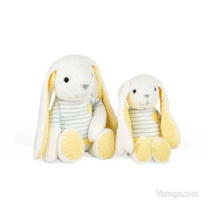 Тази плюшена играчка заек впечатлява с минималистична скандинавска визия и прецизна изработка. Заекът е облечен в синя раирана тениска с жълт джоб, а увисналите уши и лапички са в същата цветова гама, което придава хармоничен и завършен вид. Материята е копринено мека и хипоалергенна, така че играчката е приятна на допир и щадяща към чувствителна детска кожа.