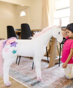 Плюшена играчка за деца Голям Еднорог Melissa & Doug. Този грациозен еднорог ще скочи направо в колекцията на всяко дете. Със своите красиви розови грива и опашка, и двете разпръснати с блестящи сребристи нишки, които улавят светлината, този очарователен приятел със сигурност ще стане нов любимец. Допълнителни неустоими детайли включват супер копринена плюшена козина, сатенени звездни декорации, красиви сини очи и мек, лъскав рог. Разгледайте още от категорията “Плюшени играчки” ТУК!