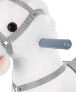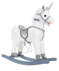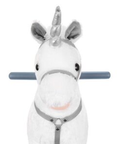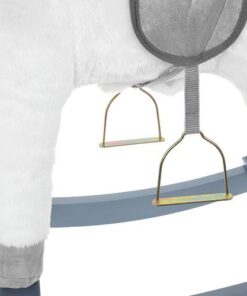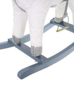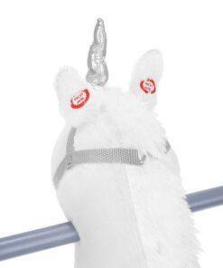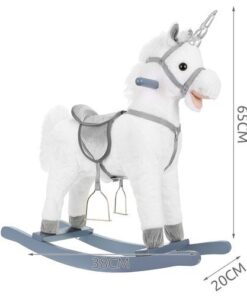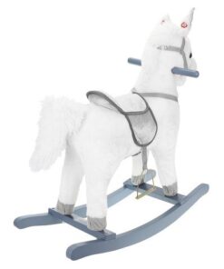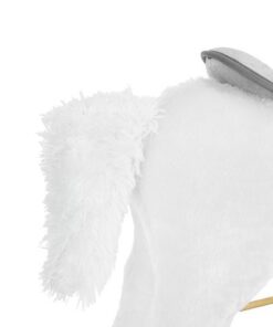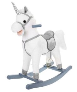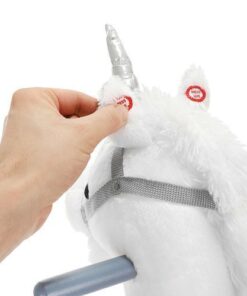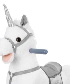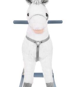 Плюшен детски еднорог-люлка в бял цвят. Люлката-еднорог ще бъде голямо забавление за децата, които обичат да гледат анимации с еднорози и кончета. Язденето е изключително забавно и тренира способността на детето за поддържане на равновесие. Юздите са проектирани така, че детето да се люлее безопасно. Играчката е с вградени тонколонки, от които излиза приятна за ухото, весела мелодия. Озвучителната система се захранва от батерии, които са разположени в корема на кончето. Конят също издава цвилине и галоп, които се активират с бутони, разположени в ушите. Задната част е изработена от мек и приятен на допир плюш, дръжките и пръчките са от лакирано дърво. Гривата и опашката на еднорога са ултра меки и приятни на допир. Когато включите музиката в еднорога, той ще започне да движи устата и опашката си. Това определено прави забавлението по-привлекателно.