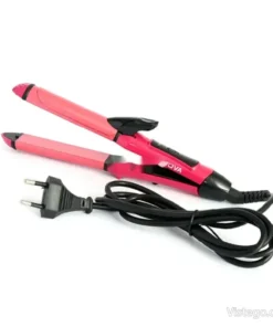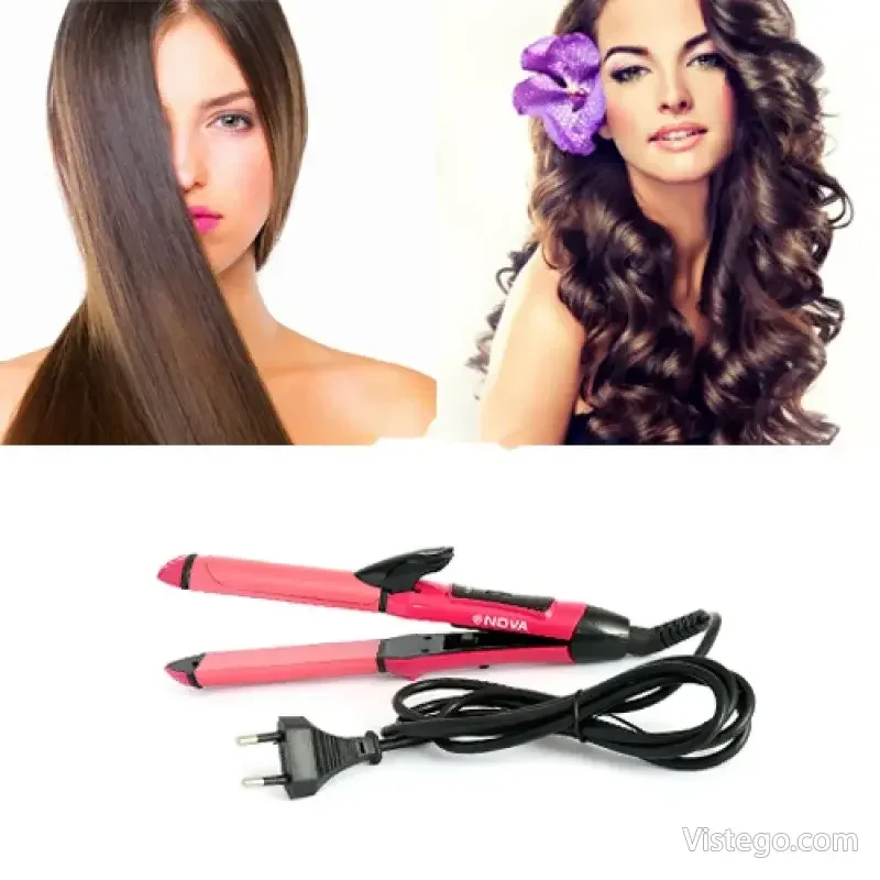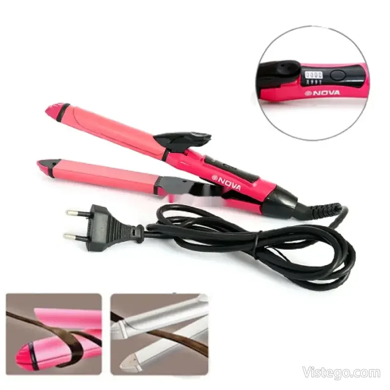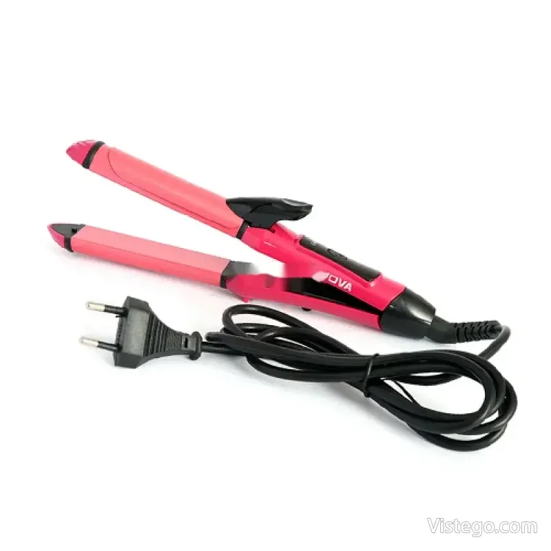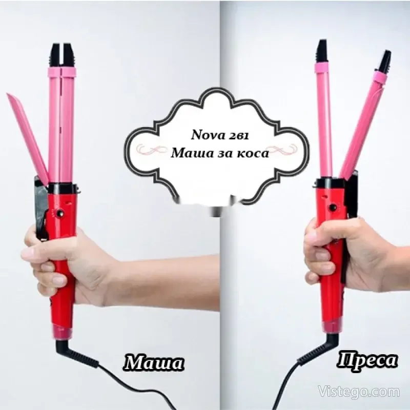 Преса и маша за коса NoVA в розово – уред 2 в 1 за изправяне и навиване, с въртящ се кабел и транспортна кутия.