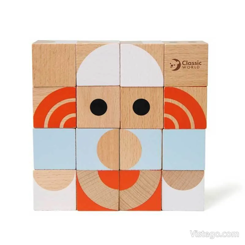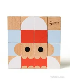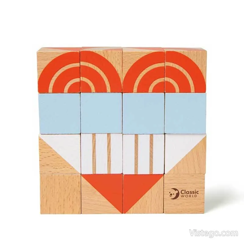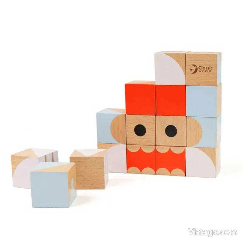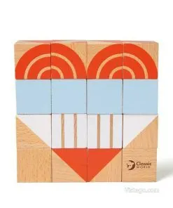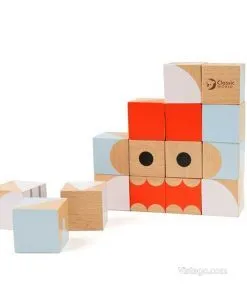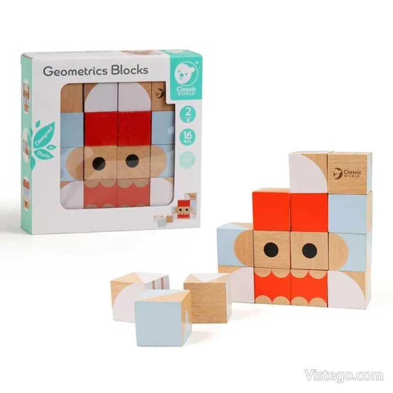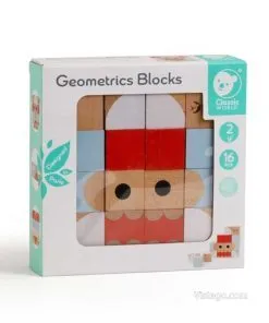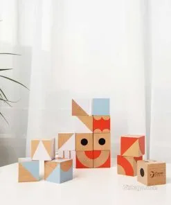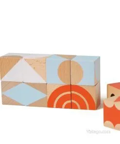 Пъзел от дървени кубчета с геометрични фигурки за подреждане и създаване на форми. Подпомага логическо мислене и творчество.