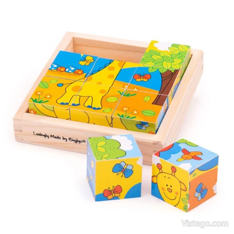 Пъзел с кубчета Bigjigs на тема сафари с дървени елементи и тавичка за съхранение. Подходящ за подреждане и развиване на сръчност.
