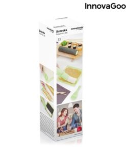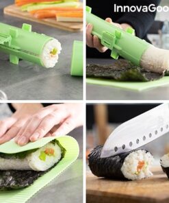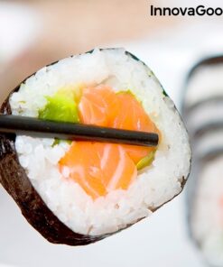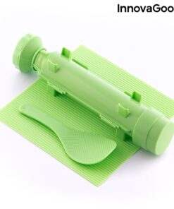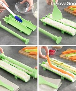 Пълен суши комплект с рецепти InnovaGoods. Пълен суши комплект, който е много удобен и практичен за по-лесно и бързо приготвяне на суши. Включва няколко аксесоара със специфичен дизайн за тази цел (форма, лъжица и постелка), които ви позволяват да постигнете професионален резултат. Първо трябва да поставите сварения ориз във формата с помощта на лъжица и да направите дупката в центъра с буталото. След това се поставят желаните съставки, притискат се и компактният оризов валяк се извлича върху водораслите. След това се разточва и притиска с подложката, нарязва се на дебели филийки и изисканото суши е готово за сервиране и удоволствие.
