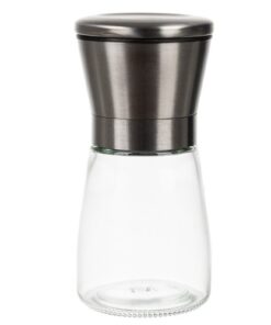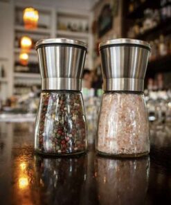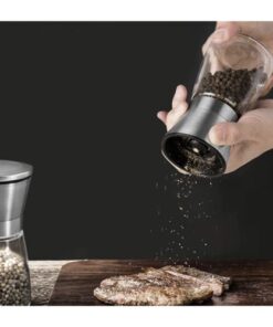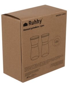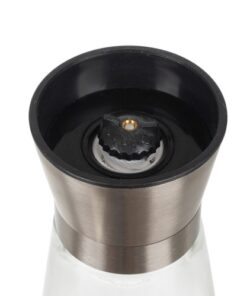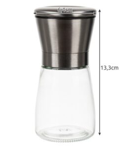 Ръчна мелничка 2 бр. Рухи 23027.S CLASSIC КОНТЕЙНЕР – той е прозрачен, така че можете да видите какви подправки и колко от тях има вътре. Има типична цилиндрична форма и широк отвор в горната част за лесно пълнене. Стъкленият материал е издръжлив, не абсорбира миризмата на подправки, така че вкусът и ароматът не се влошават. М СМЕЛИЧЕН МЕХАНИЗЪМ – изработен е от керамика и неръждаема стомана и се намира в горната част на мелачката. Състои се от две части – масивна халка с малки дупчици. Когато обърнете мелницата с главата надолу и започнете да въртите, зъбците на въртящия се диск смилат подправките в дупки в неподвижния пръстен. Втората част е копчето скрито под капака 5-степенна настройка на размера на парчетата, които задаваме според собствените си предпочитания. Силиконовото уплътнение на капака гарантира безопасността на мелничката за чушки, устойчива е на влага. ЛЕСЕН ЗА ИЗПОЛЗВАНЕ – За да използвате ръчната мелачка, напълнете стъкления съд със сол, черен пипер или други подправки и завийте горния механизъм. След това с едната ръка държим мелницата обърната, а с другата въртим частта от неръждаема стомана. Смлената подправка сега се разпределя през долната част на мелачката. Не забравяйте да махнете капака и да регулирате размера на парчетата. СМИЛАНЕ – ръчните мелнички със стъклени съдове са кухненски инструменти, използвани за смилане на подправки или билки. Всяка мелничка се състои от стъклен съд, висококачествен механизъм за мелене, копче, което регулира размера на смлените парчета подправки и запушалка. Горната част на мелачката е изработена от висококачествена неръждаема стомана.