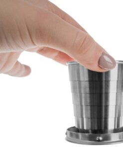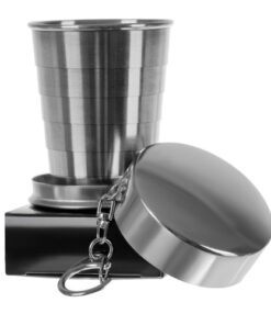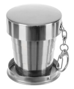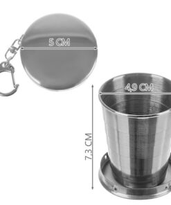 Сгъваема метална чаша ключодържател. Телескопичната чаша е много полезна преносима джаджа. Ще бъде полезна за всякакви пътувания на полето, къмпинг, излети, срещи с приятели на пейка и др. С течение на времето ще стане ваш неразделен спътник на пътувания. Чашата се разгъва, можете да налеете до 80 мл от напитката. Може да се използва като ключодържател или да се закачи на врата. Благодарение на практичната висулка с карабинер може да се закачи на панталон или да се закачи на каишка. Чашата е изработена от неръждаема стомана, благодарение на този материал никога няма да се счупи. Той е издръжлив и солиден.