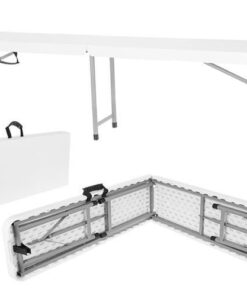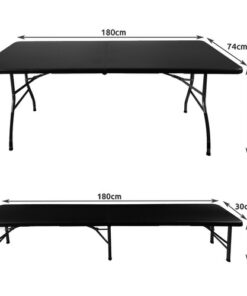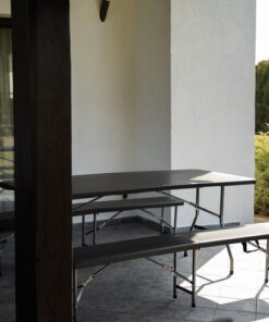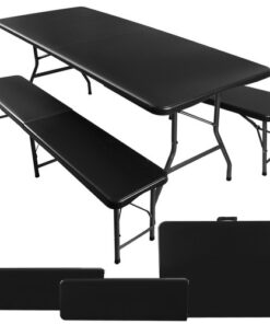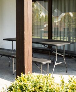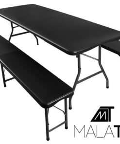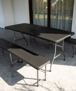 Сгъваем комплект градински мебели в черно. Идеалното решение за всички събития на открито. Изключително практичен и удобен сет. Има здрава структура – всичко е устойчиво на неблагоприятни атмосферни условия. Няколко прости движения са достатъчни, за да създадете перфектен гастрономически кът във вашата градина, който ще работи добре за партита, големи събития и барбекюта. Масата и пейките след сгъване на краката заемат малко място и са изключително лесни за транспортиране. Краката имат специални предпазители, които предотвратяват самосглобяването на продукта по време на употреба, което гарантира безопасност. Градинската маса е с изключително издръжлива и стабилна стоманена конструкция, която е устойчива на големи натоварвания и устойчива на механични повреди. Стоманата е прахово боядисана. Плотът на масата е изработен от най-висококачествена пластмаса. Той е изключително издръжлив и устойчив на лоши атмосферни условия като дъжд или сняг. Кетъринг комплектът е снабден със специални неплъзгащи се накрайници, които ще предотвратят подхлъзване на земята. Благодарение на тях не е нужно да се притеснявате, че при леко докосване масата ще се размести и съдържанието ѝ ще бъде на земята или пода. Гумираните подложки също ще предпазят пода от надраскване.