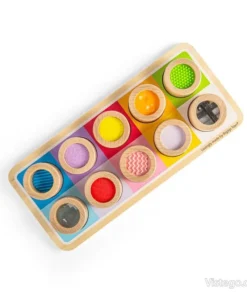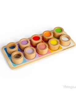 Комплектът съдържа: дървена основа; 10 кръгчета с различни текстури; дървена основа за съвпадение на цветовете; 10 малки тръбички, предлагащи различни гледки и усещания, като набразден силикон, филц, огледало и други. Отговаря на настоящите европейски стандарти за безопасност. Изработена от FSC® сертифицирана дървесина с устойчив произход и оцветена с нетоксични бои и лакове.