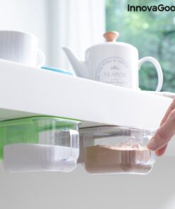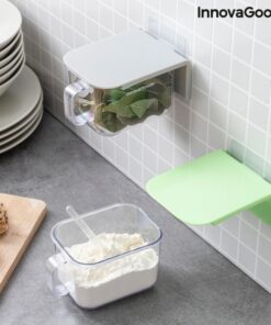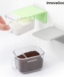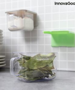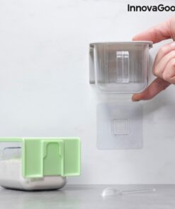 Сет кухненски поставки лесни за смяна InnovaGoods е комплект от два подвижни залепящи се кухненски контейнера, изключително гъвкави и адаптивни благодарение на оригиналния си, многопозиционен и преносим дизайн. Вместимостта на всеки контейнер е 420 мл. Имат капаци с релси и централна дръжка за захващане, което ги прави лесни за сваляне. Тези модерни и практични многофункционални поставки са идеални за съхранение на различни подправки и други храни като сол, черен пипер, риган, чесън на прах, захар, кафе, брашно и др. Комплектът включва 2 чаени лъжички, 2 едностранно вертикални лепенки и 2 двустранно хоризонтални лепенки. Включеното висококачествено лепило (Nano PU Gel) ги прави лесни за инсталиране без монтаж или инструменти, много е здраво и осигурява стабилно задържане. Освен това тези лепила могат лесно да се отстранят, без да оставят никакви остатъци по повърхността и могат да се поставят на друго място. В зависимост от предпочитанията има различни опции за позициониране, на стената или под кухненски шкафове или рафтове.
