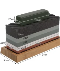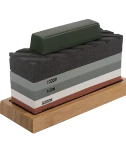 – ВКЛЮЧЕНО: камъни с градация: 400 / 1000 / 3000 / 8000; 2 гумени стойки; бамбукова стойка с неплъзгащо се дъно; подложка за полиране на кожа; паста за полиране на ножове; дръжка за държане на длето, дърводелски нож; дръжка за задържане на острието; камък за изравняване на повърхността на брусове