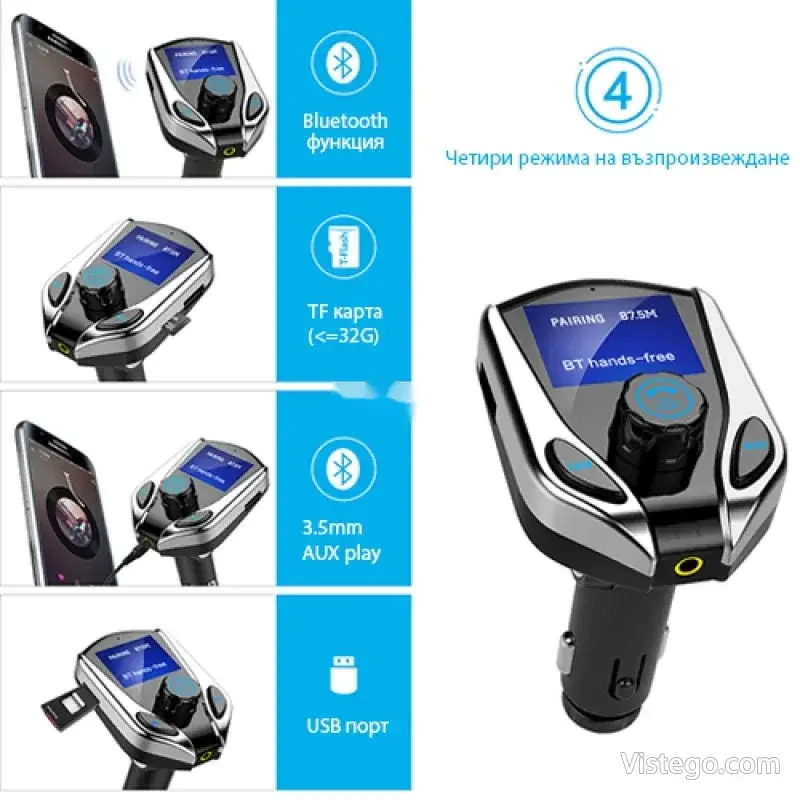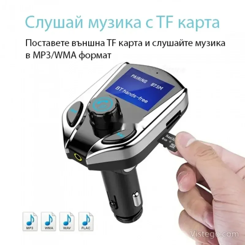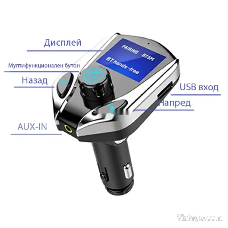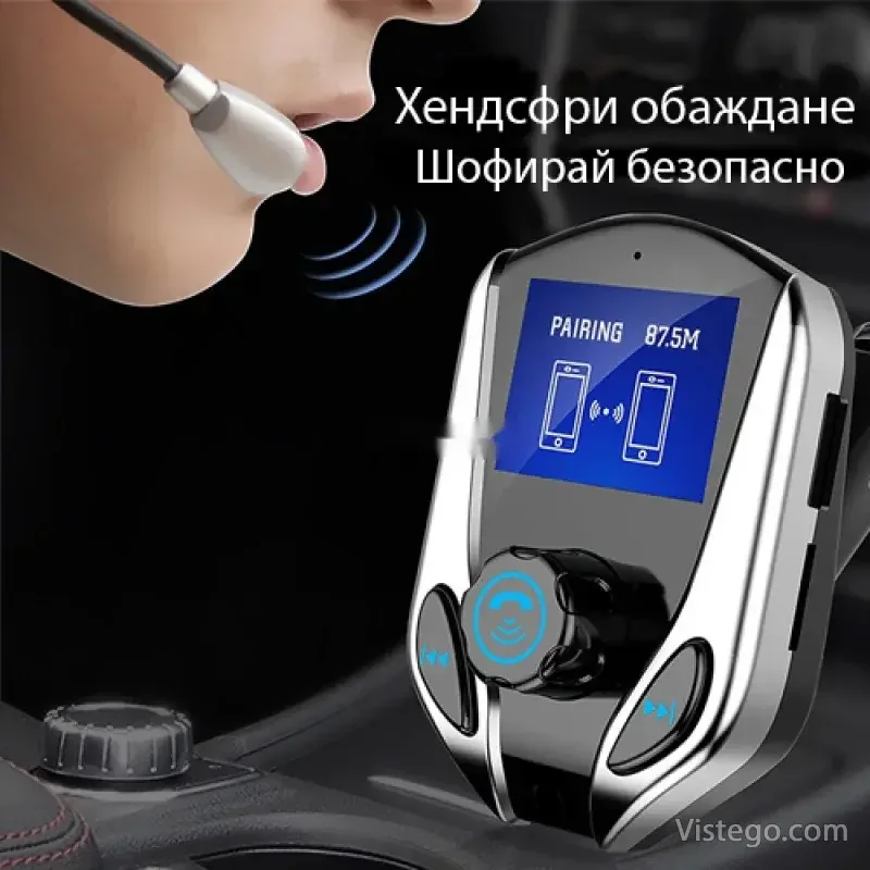 Този хендсфри трансмитер за кола комбинира връзка, звук и зареждане в една компактна конфигурация. Двойният USB вход е удобен, когато в колата има повече от един телефон, а бързият достъп с бутон помага да реагирате навреме, без да усложнявате управлението. Вградените възможности за музика и радио позволяват да избирате между лична колекция и ефирно съдържание според момента.