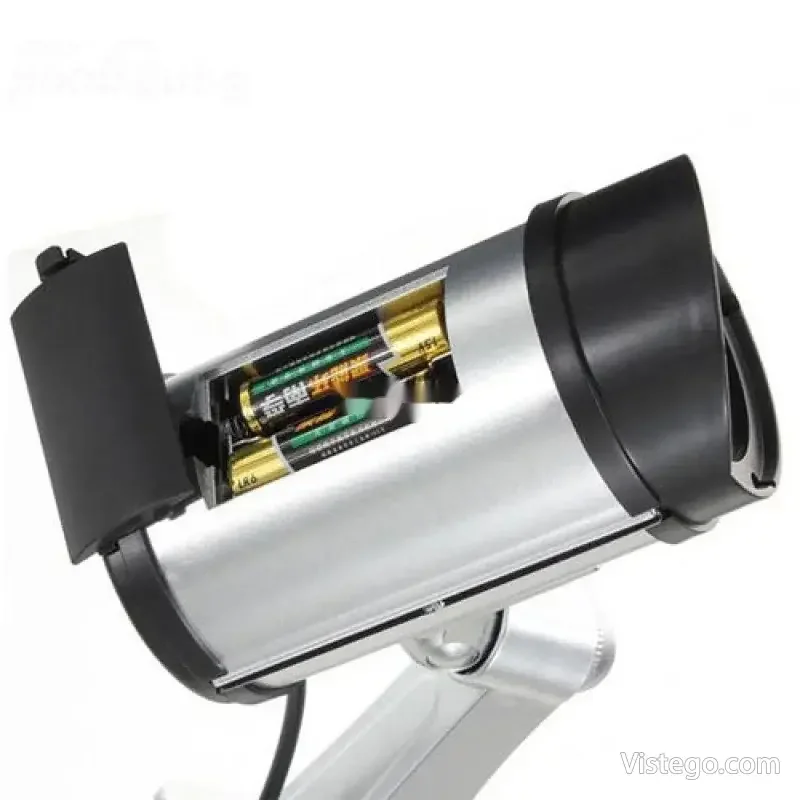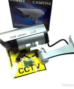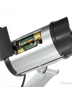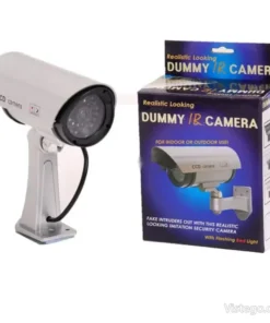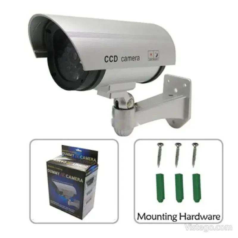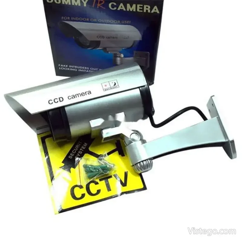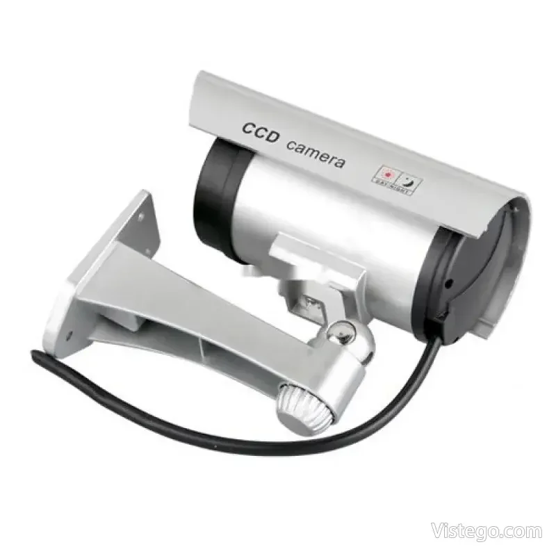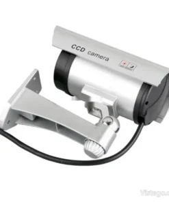 Фалшива камера за видеонаблюдение с реалистичен вид, светлинна индикация и лесен монтаж без кабели, подходяща за вътрешно и външно.