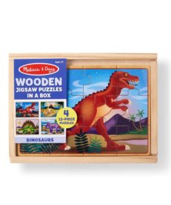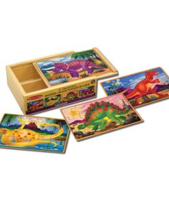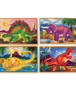 Четири дървени пъзела Динозаври Melissa & Doug. Комплектът включва четири дървени пъзела с динозаври от 12 части – трицератопс, апатозавър, стегозавър и T-Rex, всеки съхраняван в отделно отделение на здрава дървена кутия! Плъзгащият се капак на кутията служи и като удобна дъска за пъзел! Всяка част от пъзела е с кодирана форма на гърба за лесно сортиране. Чудесно за пътуване! Разгледайте още от категорията “Дървени пъзели” ТУК!