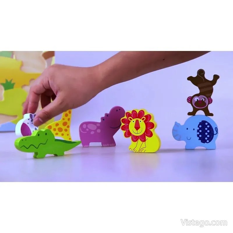 Пъзелът включва няколко отделни фигурки на диви животни: хипопотам, маймунка, зебра, слонче, жираф, крокодил и лъвче. Всяко животно има собствен контур върху дъската, което улеснява ориентирането и прави задачата ясна дори за най-малките.